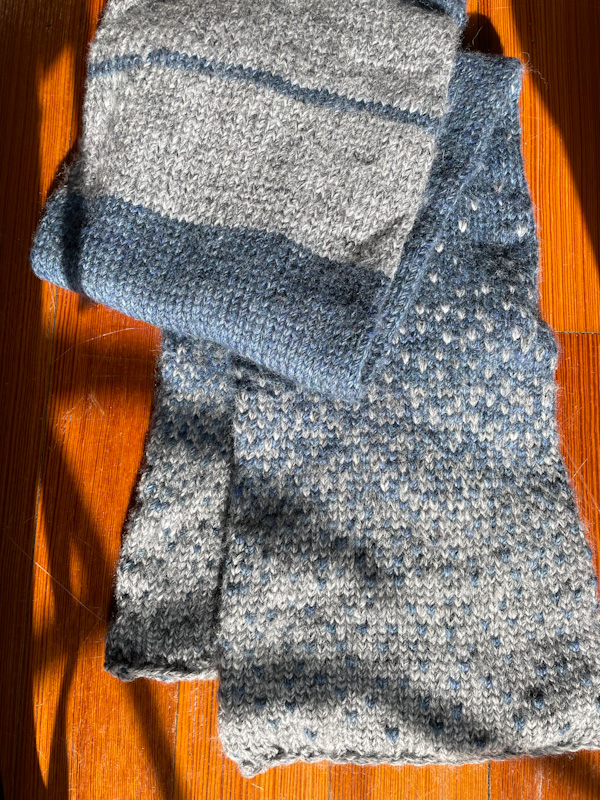 Used yarn I bought on a previous trip to Canada: the Belfast Mini Mills Specialty Sock yarn (husky fur!) doubled to match the blue Island (PEI) collection.